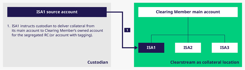 Clients with an Individual Segregation Account under legal regime Title of Transfer may deliver securities collateral from their source account at CEU/CEU-Int 6 series account to the dedicated Eurex Clearing collateral account at Clearstream via a free of payment (FOP) MT54x SWIFT instruction.