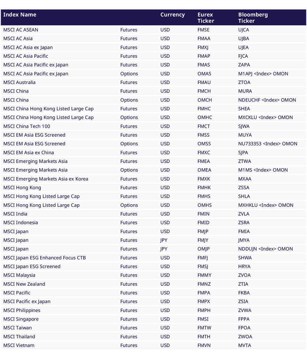 유렉스는 지역 및 개별국가 지수에 대한 선물 및 옵션들로 포괄적으로 구성된 파생상품들을 제공하는 유일한 거래소입니다. 현재 150개의 MSCI 선물과 23개의 MSCI 옵션을 제공하고 있으며 이들은 신흥국 시장(EM)과 선진국 시장(DM), 다양한 지수 유형들(NTR, GTR, 가격지수)과 통화(유로, 달러, 파운드, 엔)를 기초자산으로 합니다.