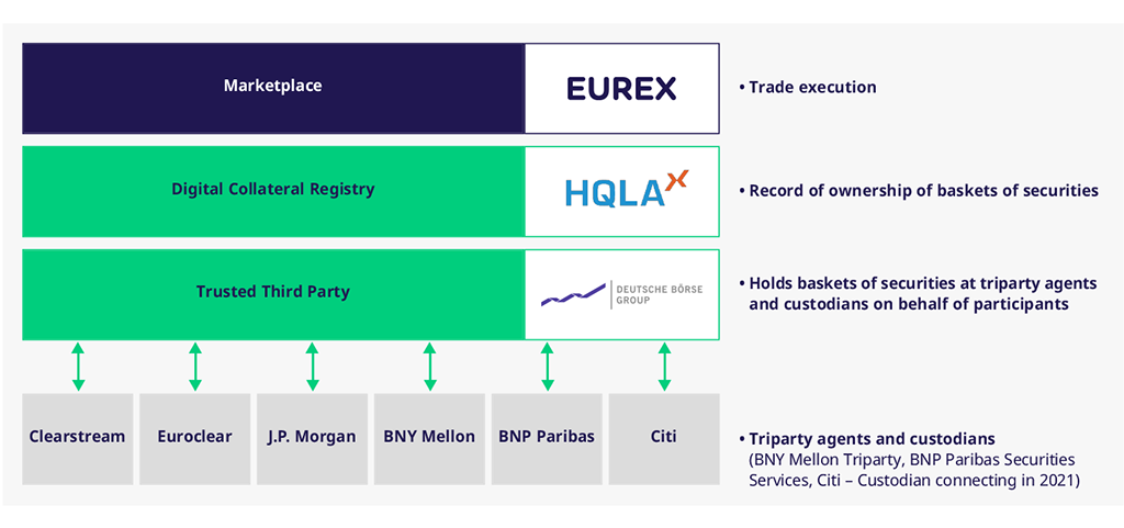 Eurex Repo GmbH provides a single marketplace to provide access for participants to the HQLAx model by allowing non-anonymous trading of baskets vs baskets. Executed transactions will then be processed by HQLAx using Corda® distributed ledger technology (DLT) to digitally represent baskets of securities.