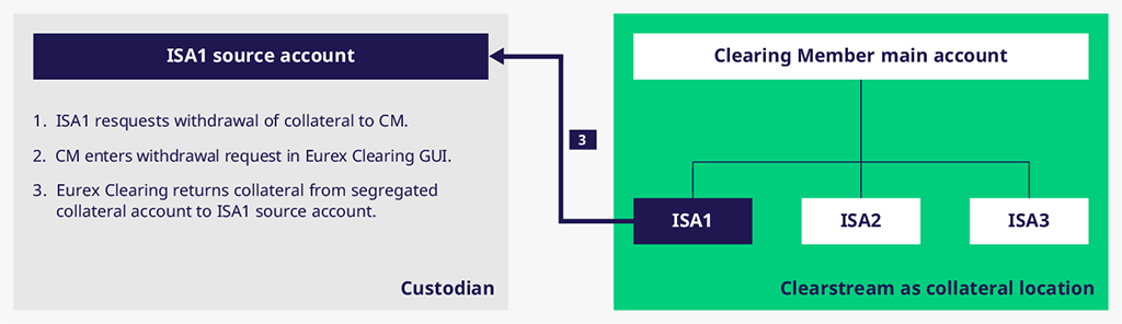 Clients with an Individual Segregation Account under legal regime Title of Transfer may deliver securities collateral from their source account at CEU/CEU-Int 6 series account to the dedicated Eurex Clearing collateral account at Clearstream via a free of payment (FOP) MT54x SWIFT instruction.