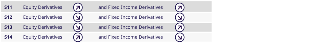 For example, when combining equity price up-movements and fixed income price up-movements (see scenario “S11” in the illustration), only those stress scenarios are considered for the worst-case scenario determination that assume an up-movement of equity prices. The same holds true for fixed income scenarios.