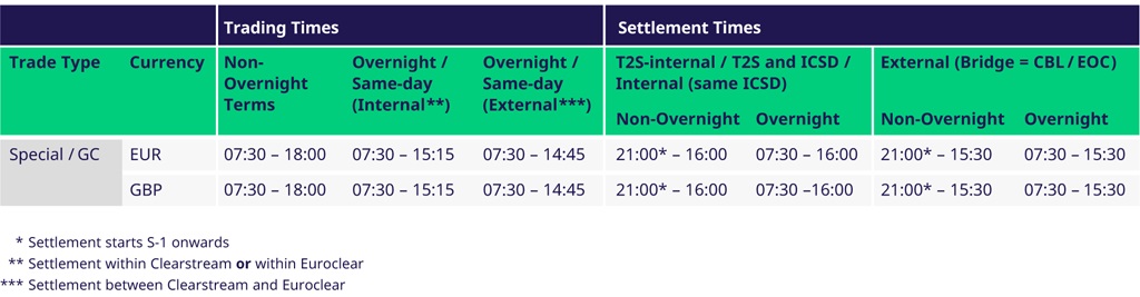 The Special and GC Repo segment ensures straight-through processing with automated connectivity to Eurex Clearing AG as central counterparty and the settlement organizations Clearstream Banking and Euroclear.