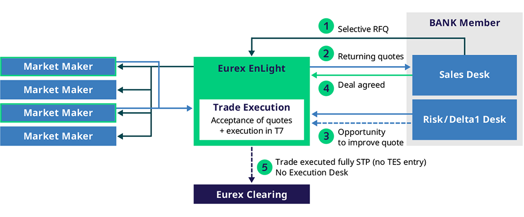 Eurex EnLight is a fully integrated exchange RFQ platform. The fully automated solution replicates the core aspects of voice trading while providing its users all the advantages of automatic electronic price formation, data collection and timely information retrieval to meet MiFID II Best Execution requirements.